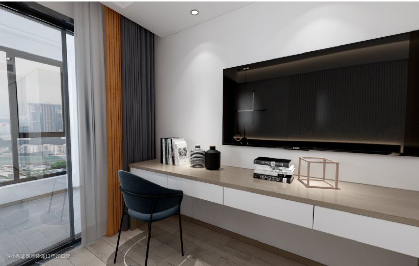 予落地窗前定制超长书桌,木色台面让整个空间显得舒适自然。