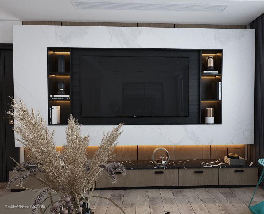 电视柜整体色调以纯净白大理石与木色为底,干花点缀互相交合而成;