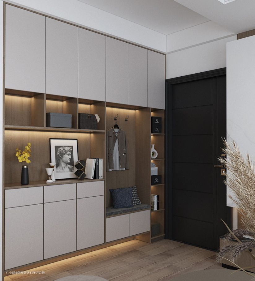 了解到屋主不喜欢太复杂的元素,但是又想能够有足量的收纳空间,收纳柜部分是白色与木色相结合的与板材贯穿室内元素,时尚温馨;