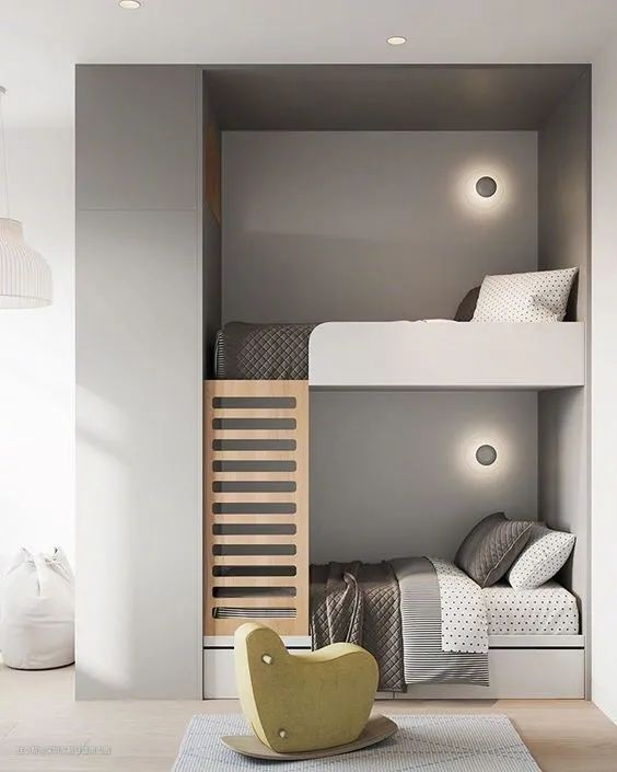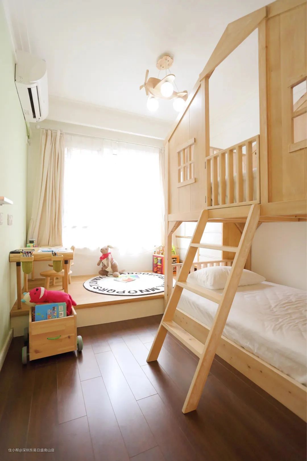 必要的话,可以设置隔帘或隔板遮挡,将房间空间一分为二,让双方拥有一定的私密空间,这样设计短期提高空间利用率,长期来说更适合两个孩子的成长。