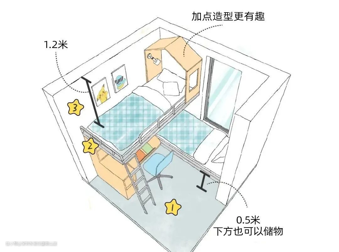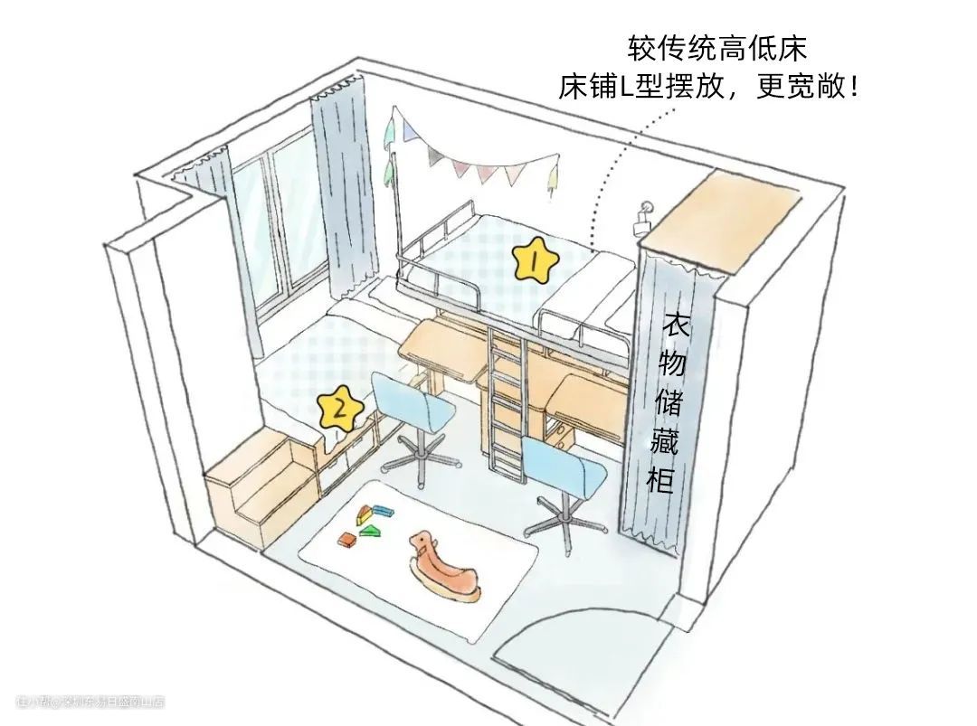 或者设计成L型高低床,床铺L型摆放,更方便孩子交流,增加乐趣。利用床下空间增加学习、储物功能。