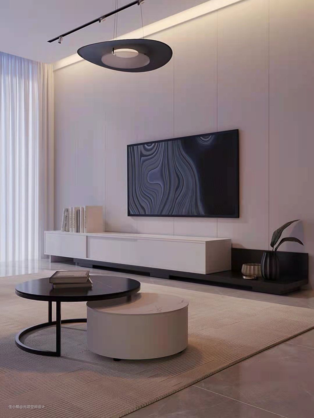 想要客厅显大,电视柜一字设计,线条流畅洁净,用极简和纯粹打造设计空间。