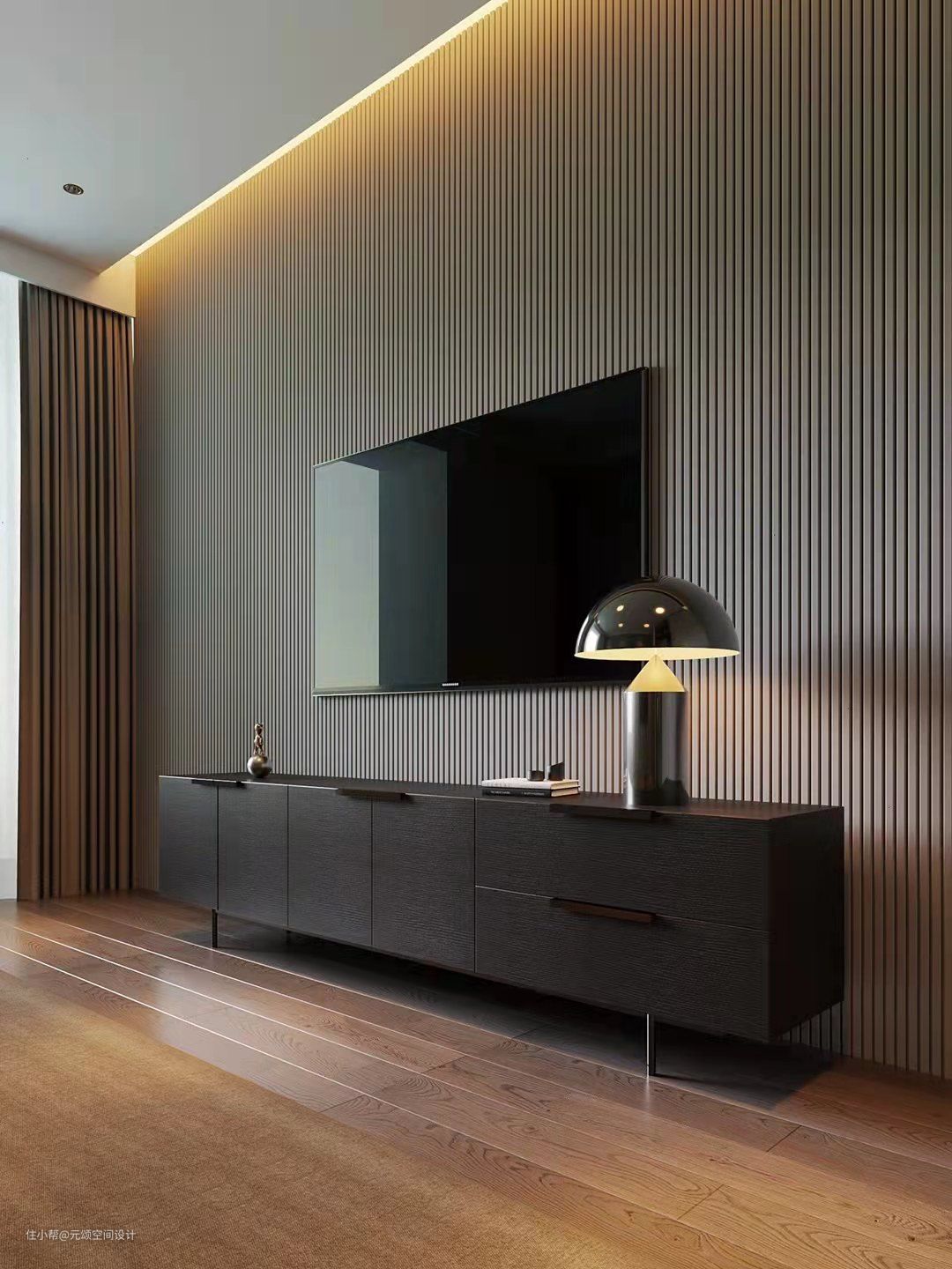 这是极简风格采用格栅和灯光的融合;选用了纹路霸气十足的电视柜