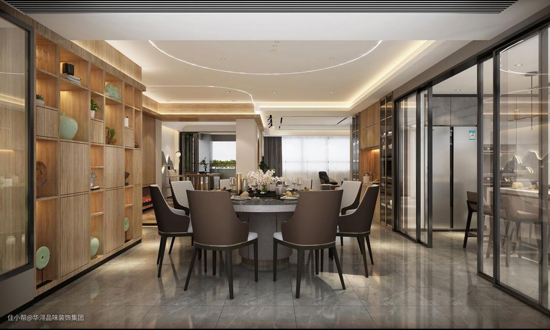 在展示柜中还安装了暖色灯光,木纹加上暖色光线让餐厅的氛围自然且温馨。