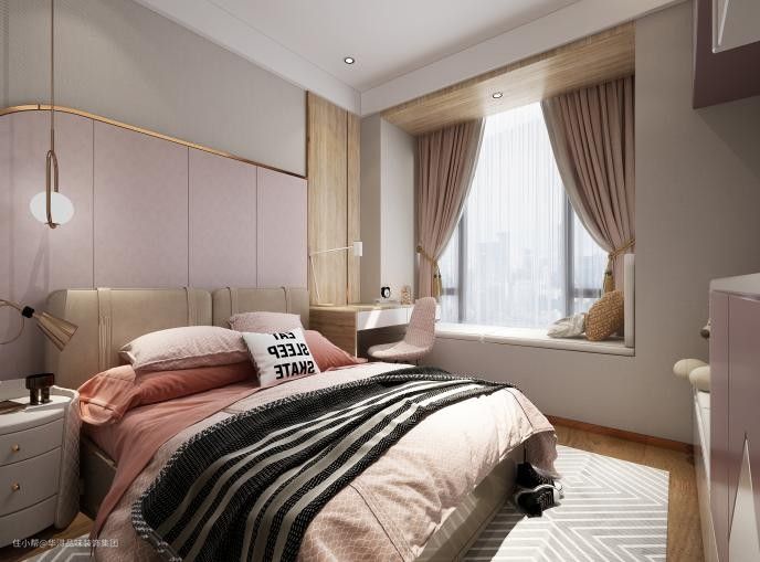 女孩的卧室中加入了大量的粉色调,空间氛围更加活跃,这种空间更适合年纪较小、性格活泼的女孩居住。