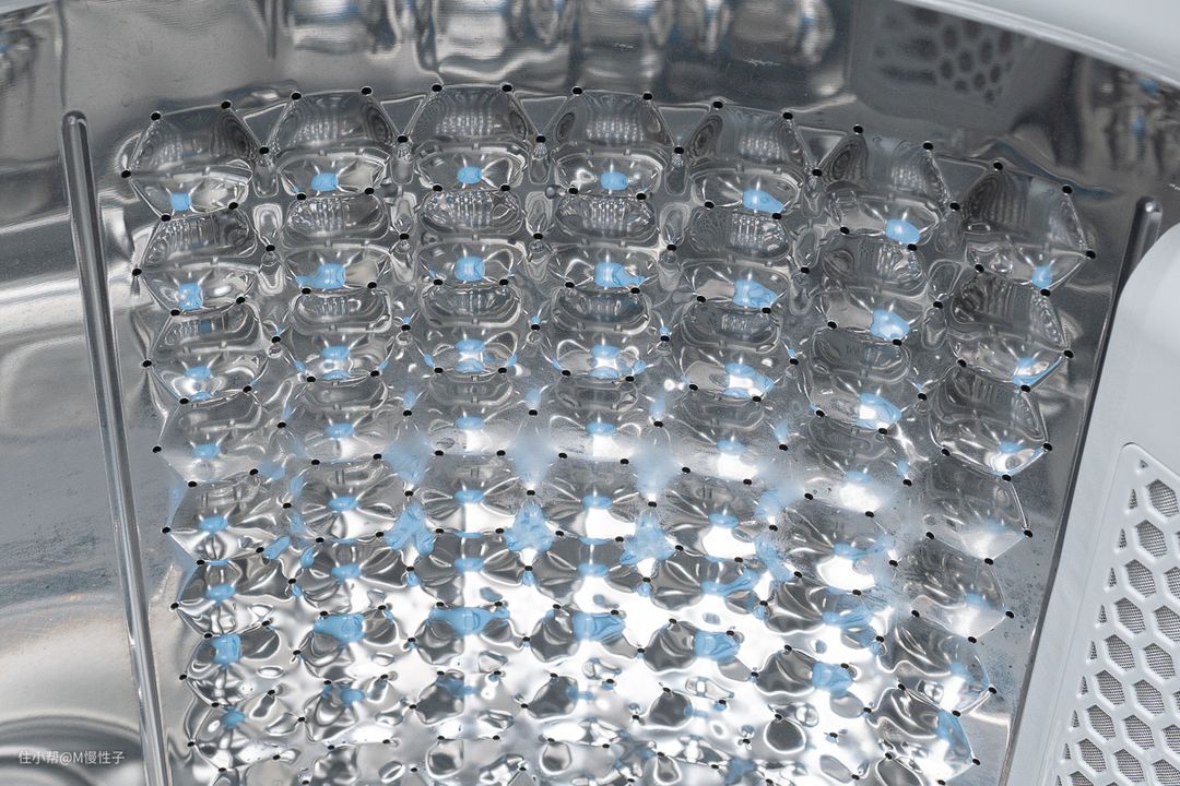 内桶包括底部的波轮都采用了不锈钢的材质,防污耐用的同时,侧面的蜂巢结构可以防止衣物被拉丝起球,减少衣物的磨损。