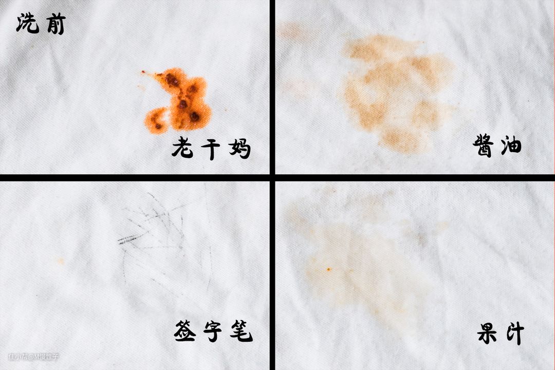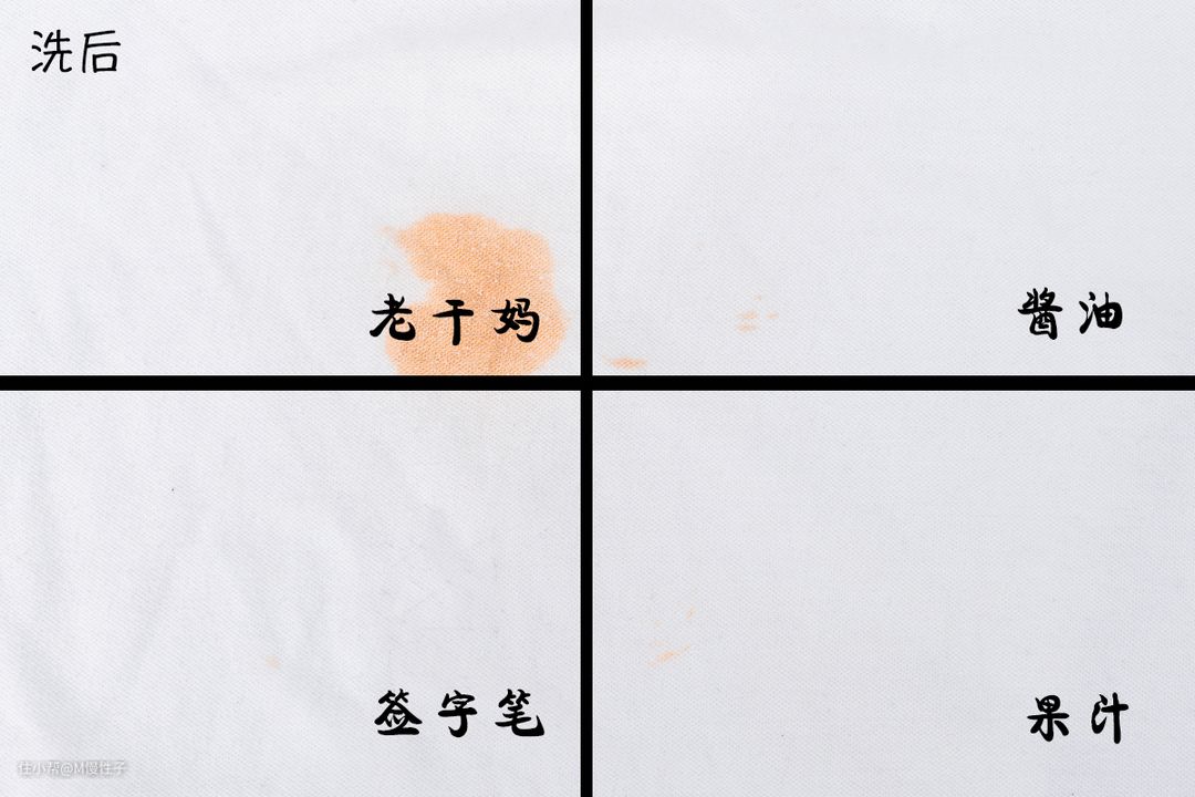 ▼可以看到,在1小时的常规混合洗后,即使像老干妈这种有大量油脂的,也变浅了,其他酱油、果汁都洗得十分干净,签字笔只有轻微印子。