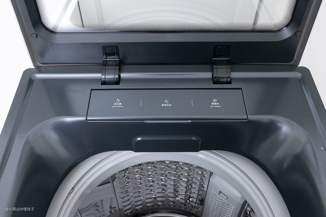 打开顶盖后,可以看到洗衣液投放区,一次最多可以投放600ml洗衣液和600ml柔顺剂,基本上够1个月的日常使用,洗衣液和柔顺剂余量不足时还会发出提醒,十分智能省心。P9的AI智能投放功能,还可以自动感知衣物重量,精准自动投放洗涤剂及柔顺剂,使用上非常方便的同时,也不会怕自己手动投入时太多有残留,太少洗不干净衣服。
