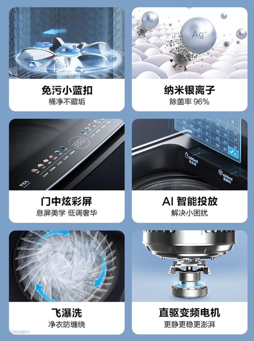 TCL针对于洗衣机二次污染的问题,最新推出了小蛮腰 P9 免污直驱洗衣机,创新设计了免污小蓝扣,可以在免工具的情况下,快速地拆卸底部的波轮,不需要专业人员,仅用双手就能轻松清洁,使得桶净不藏垢,配合上纳米银离子除菌模块,做到真正的免污除菌。