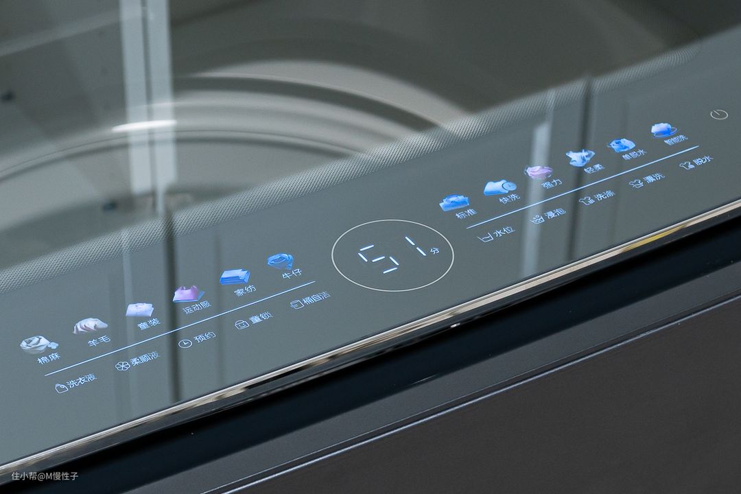 顶部的机盖采用了全玻璃的材质,在便于查看洗衣情况的同时,也与全金属的机身相呼应,进一步地提升了高级感。
