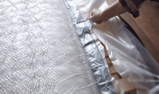 隔开胶带和外面的包装袋,还有一个真空袋,先要展开床垫。还是这样蜷缩的状态。灰色这面是背面。