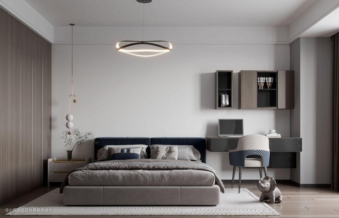 主卧的布置精致舒适,木质的柜门做的到顶的设计,顶部的吊灯搭配着床头一侧的吊灯,营造出一个精致的氛围,在床头一侧做了一方书桌,满足临时的办公需求。