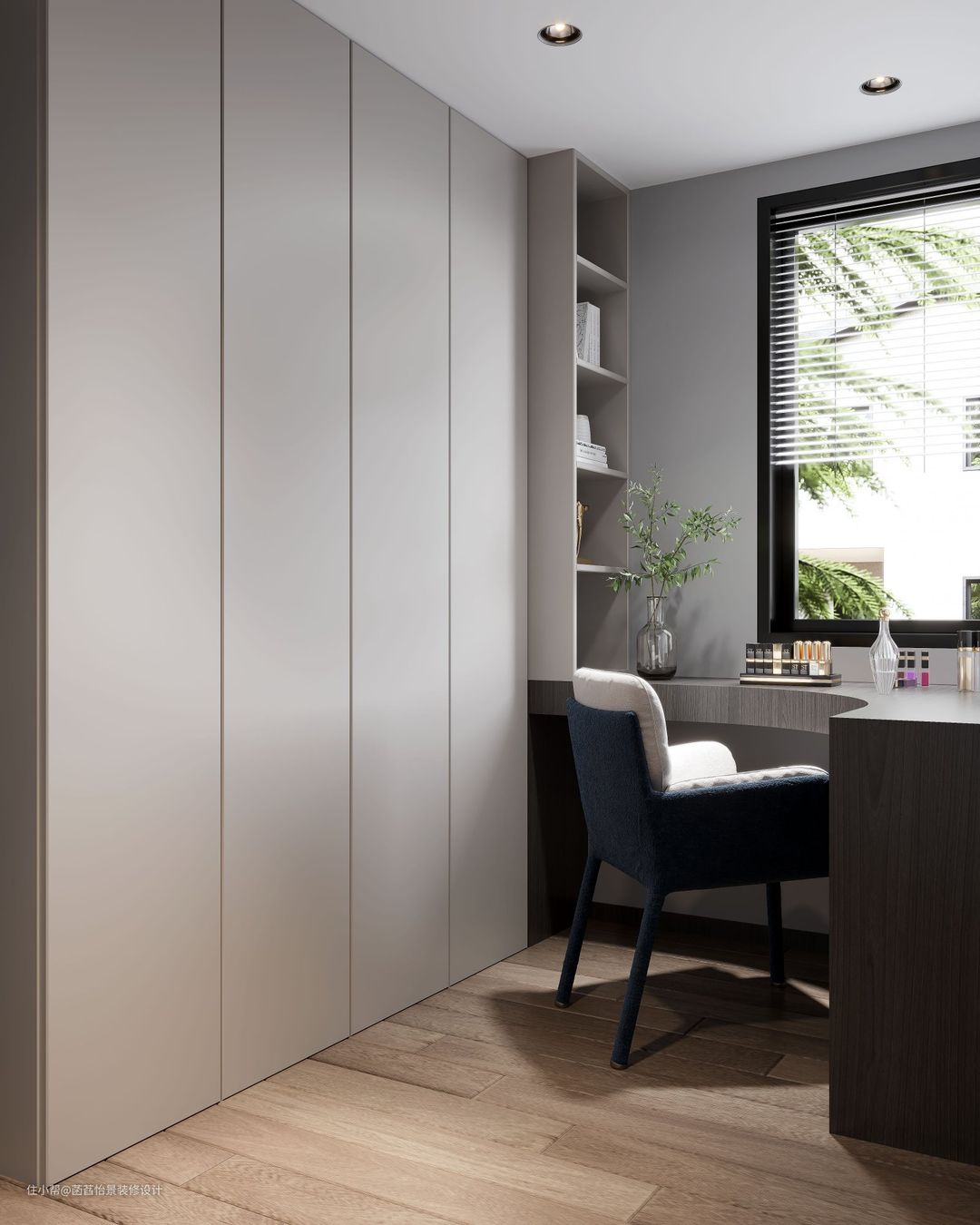 利用小次卧做的一个衣帽间兼书房的设计,在窗台处做了一个圆弧型的书桌,满足日常的学习办公需求。