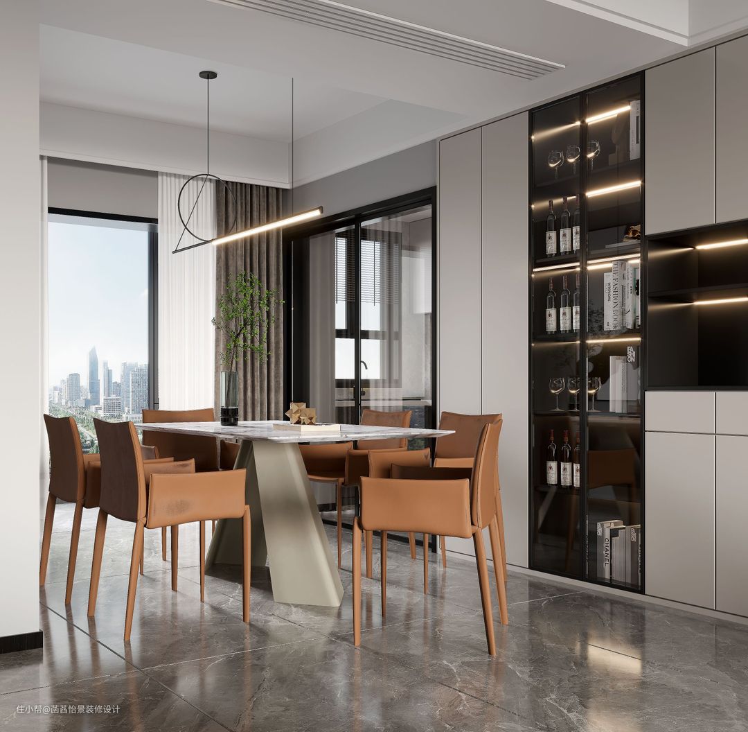 餐厅在一个独立的区域,石材的餐桌搭配着顶部的吊灯,与定制的餐边柜,一面大窗户为餐厅提供了充足的采光与自然之感。