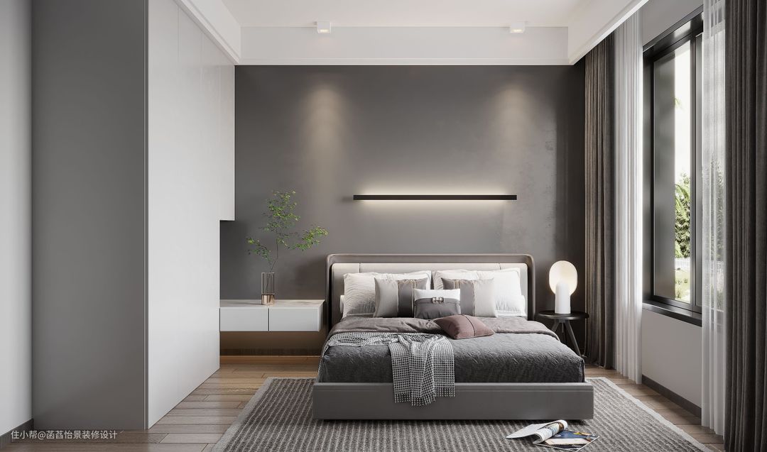 次卧的布置简单舒适,灰色调的床头背景墙加入一盏壁灯,营造出一个精致的氛围感,定制的柜子做的极简的到顶设计,增加空间的收纳。