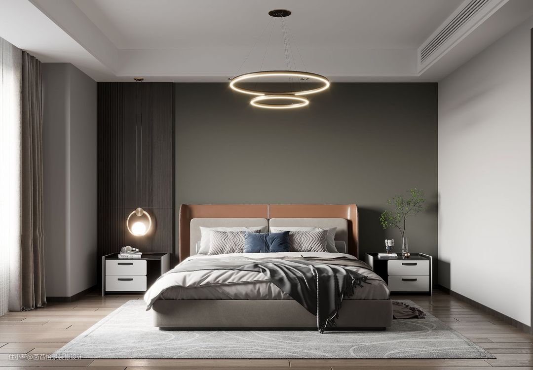 父母房的布置与主卧一致,灰色调的床头背景墙搭配着一张棕木色的双人大床,顶部的吊灯与床头的灯光搭配使用,明亮而舒适、