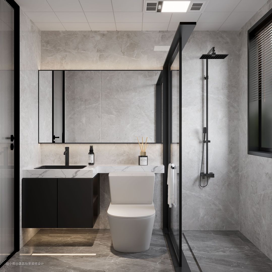 卫生间利用灰色调的墙地面砖铺贴搭配着白色的洁具,营造一个干净整洁的空间感,利用玻璃门将淋浴间隔断开,保障日常使用的卫生。