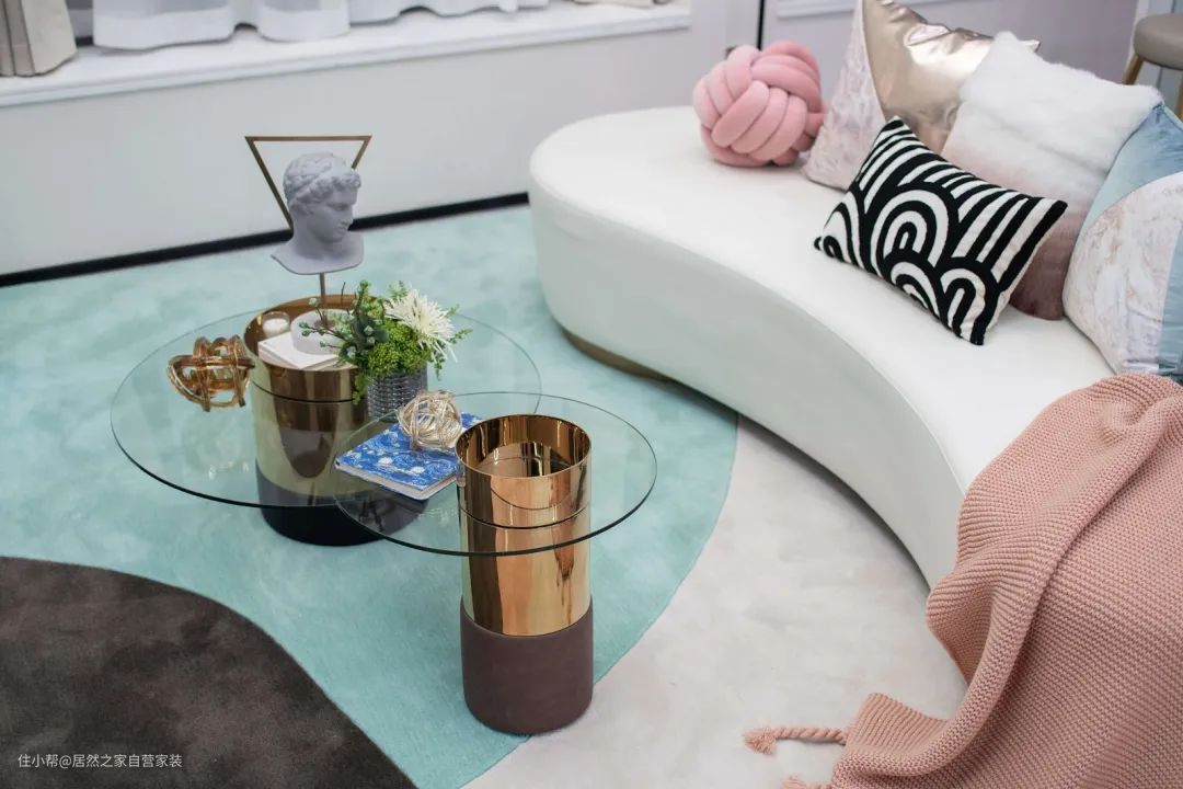 ▲米白色的弧形沙发,搭配上双拼的圆形玻璃茶几组合,加入精致的软装装饰点缀,让客厅显得更加温雅精致而高级舒适。