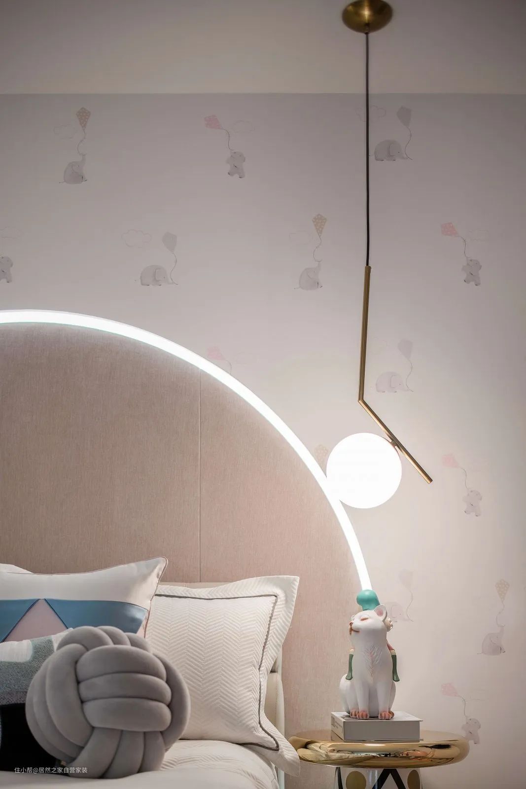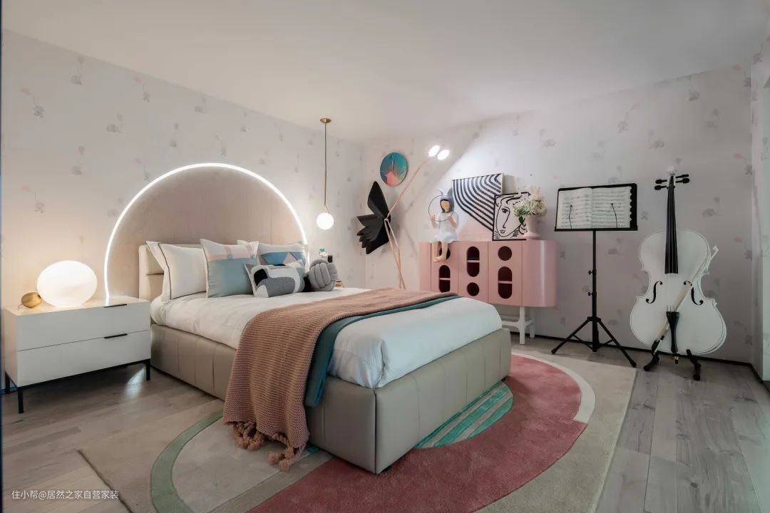 ▲儿童房整个空间色调浅淡,墙面是小象图案的墙布张贴,摆上一张半圆形靠背的床铺,床头靠背边边还有灯带装饰,加入粉色床单、地毯与斗柜,还有可爱的公仔与摆饰品,营造出一种浪漫舒适的公主范空间。