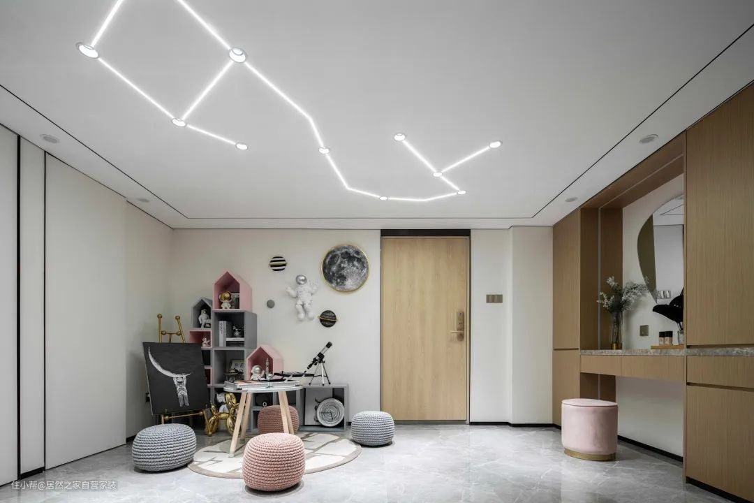 ▲多功能房布置儿童家具,成为孩子玩耍活动的空间;同时还加入了梳妆台,为主人提供了一个梳妆打扮的位置,天花上独特的条形灯带组成的特殊灯具,也让空间显得更加神秘有趣。