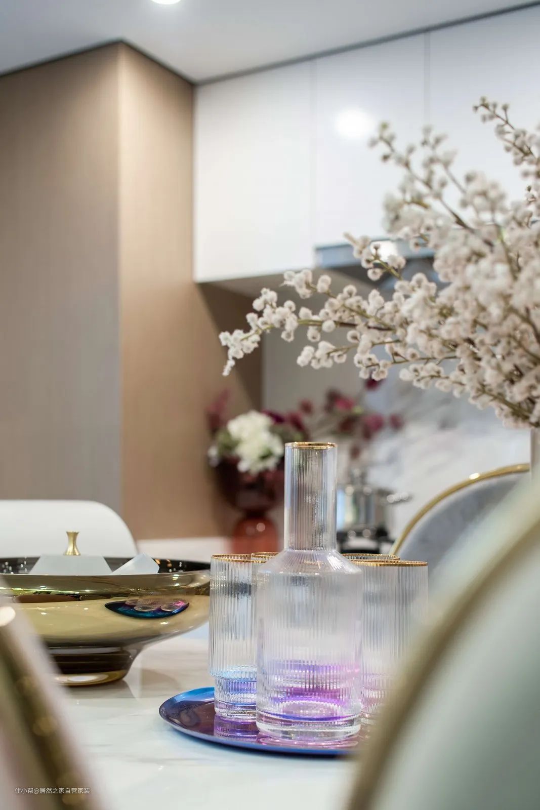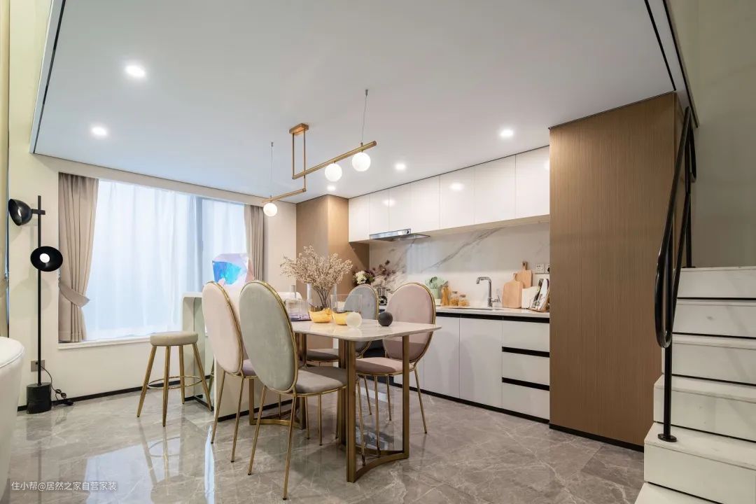 ▲餐厅与厨房采取开放式的格局,轻奢质感的金属架餐桌椅,餐椅还是淡淡的粉色与绿色布艺坐垫与靠背设计,加上白色石材的台面设计,一旁定制一字型的橱柜操作台,让餐厨空间显得浪漫情趣而又实用惬意。