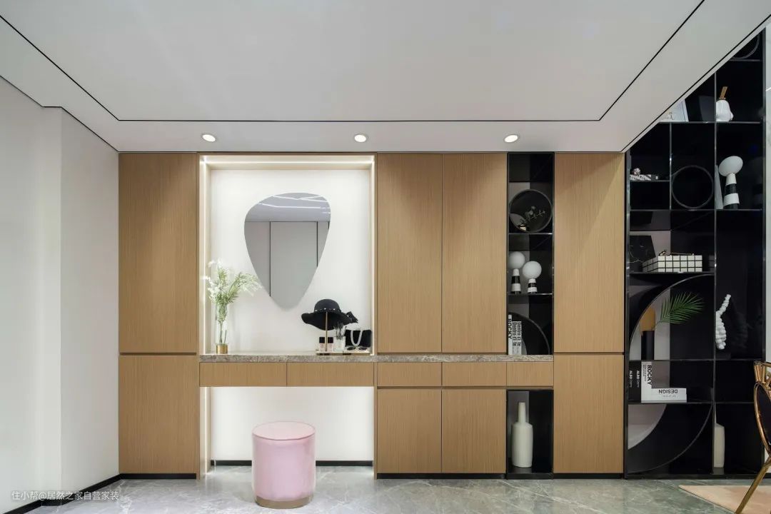 ▲侧边定制木色的收纳展示柜,中间留空出一个展示台的位置,搭配粉色的凳子,还有一面造型独特的镜子,让这个位置可以成为女主人梳妆打扮的舒适区域。