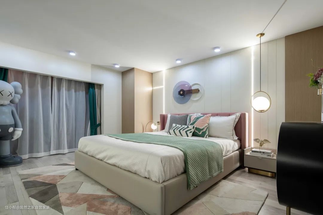 ▲卧室床头墙以米白色的硬包背景墙设计,布置浅灰色皮艺床,淡紫色的床靠背与绿色+白色的床单组合,地面铺设灰色与粉色几何色块图案的地毯,使得空间充满浪漫舒适的气息感。