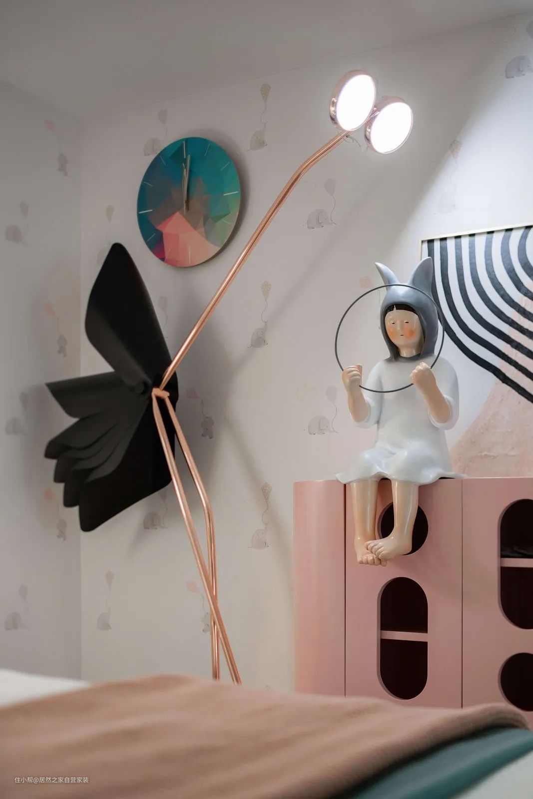 ▲金属架的落地灯,还有可爱的陶瓷摆饰品,让儿童房空间显得优雅而童趣。