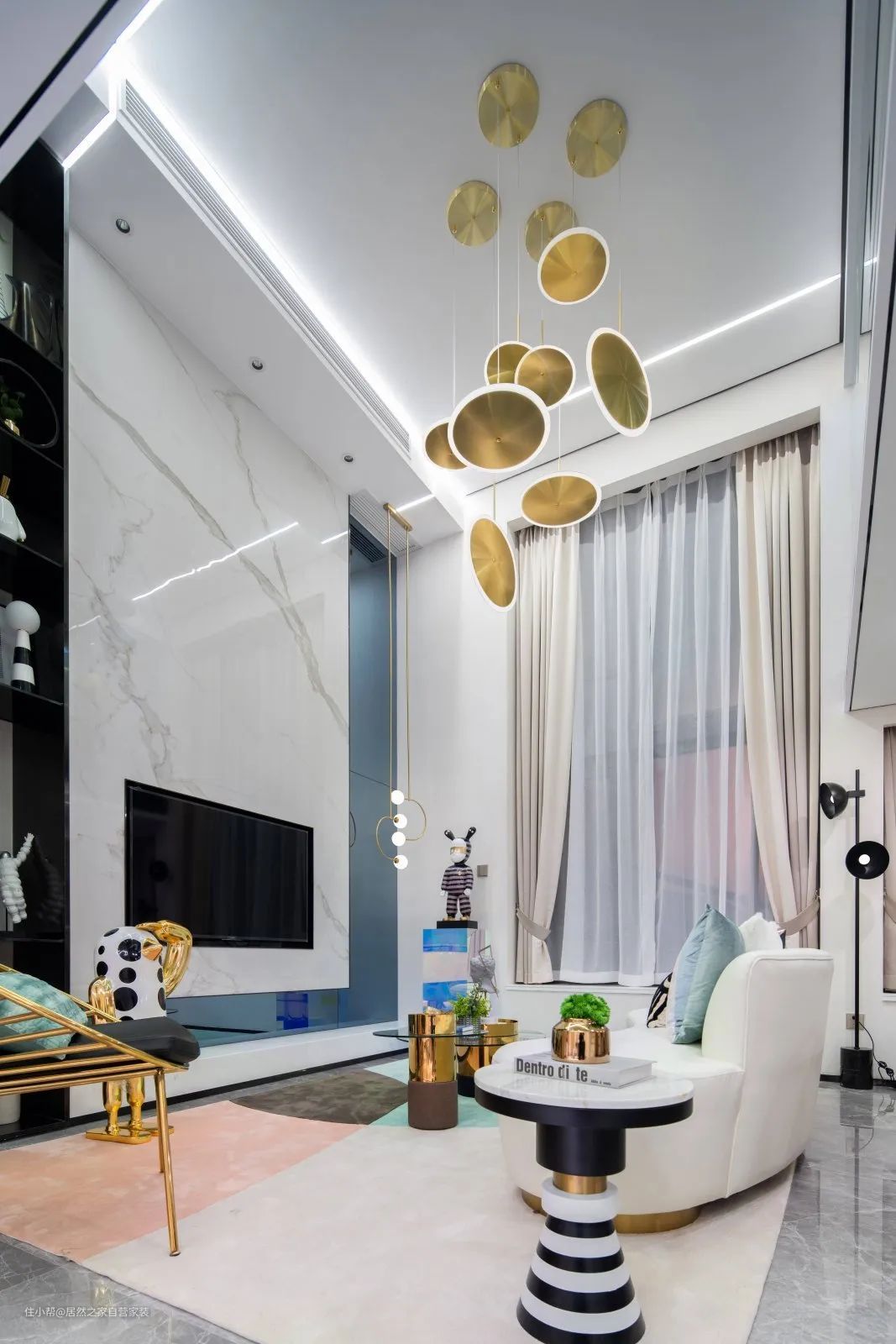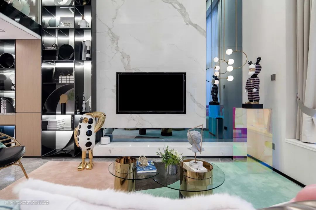 ▲现代大方的客厅空间,加入大面积的岩板为电视背景墙,搭配金属材质的家具与吊灯,还有米白色的皮沙发,浪漫清新的拼色地毯,营造出一种温情优雅而浪漫舒适的客厅氛围感。
