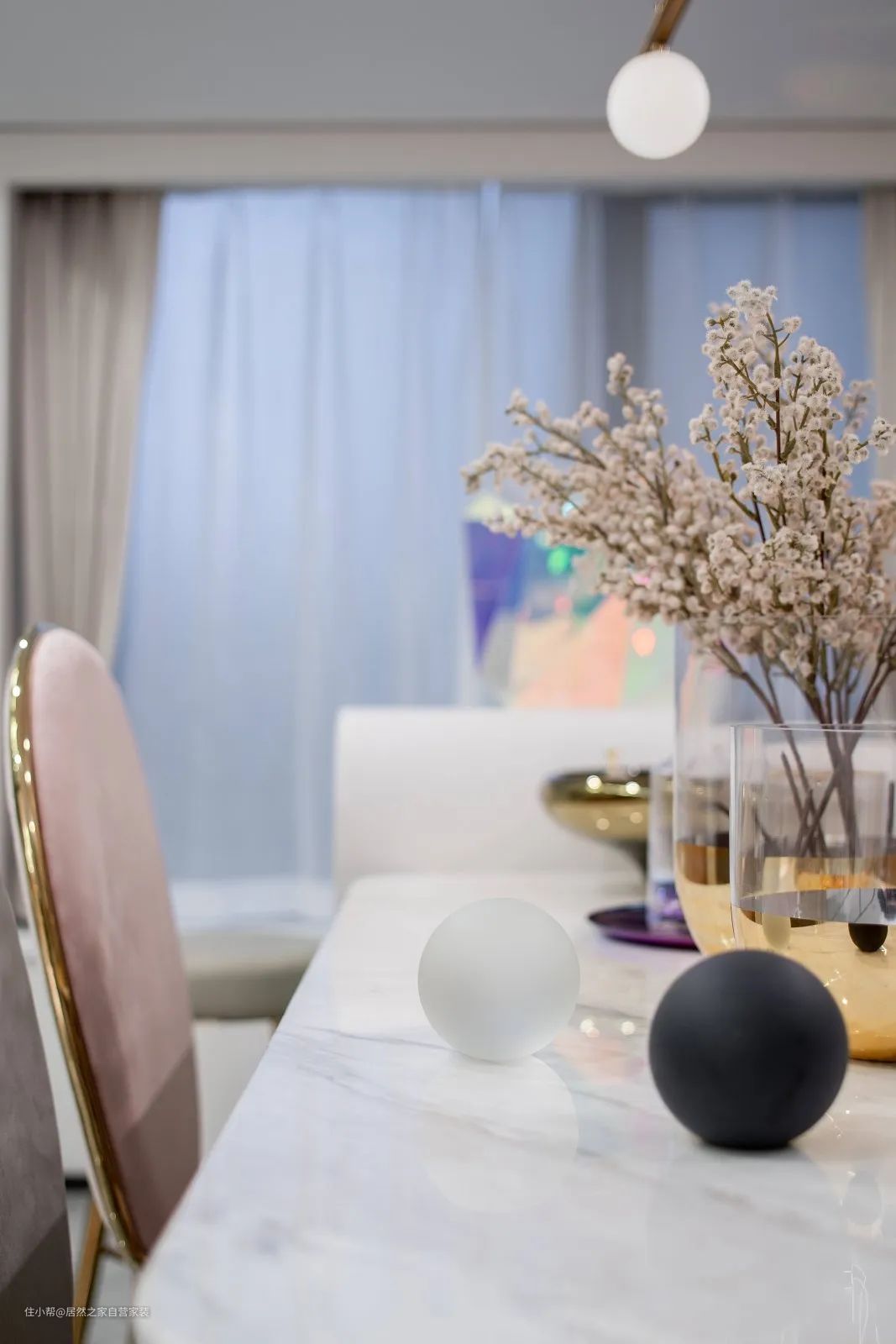 ▲餐桌上精致的玻璃杯具器皿,插上干花装饰,还有球形黑白配的装饰品,也让用餐空间显得时尚优雅而高级。