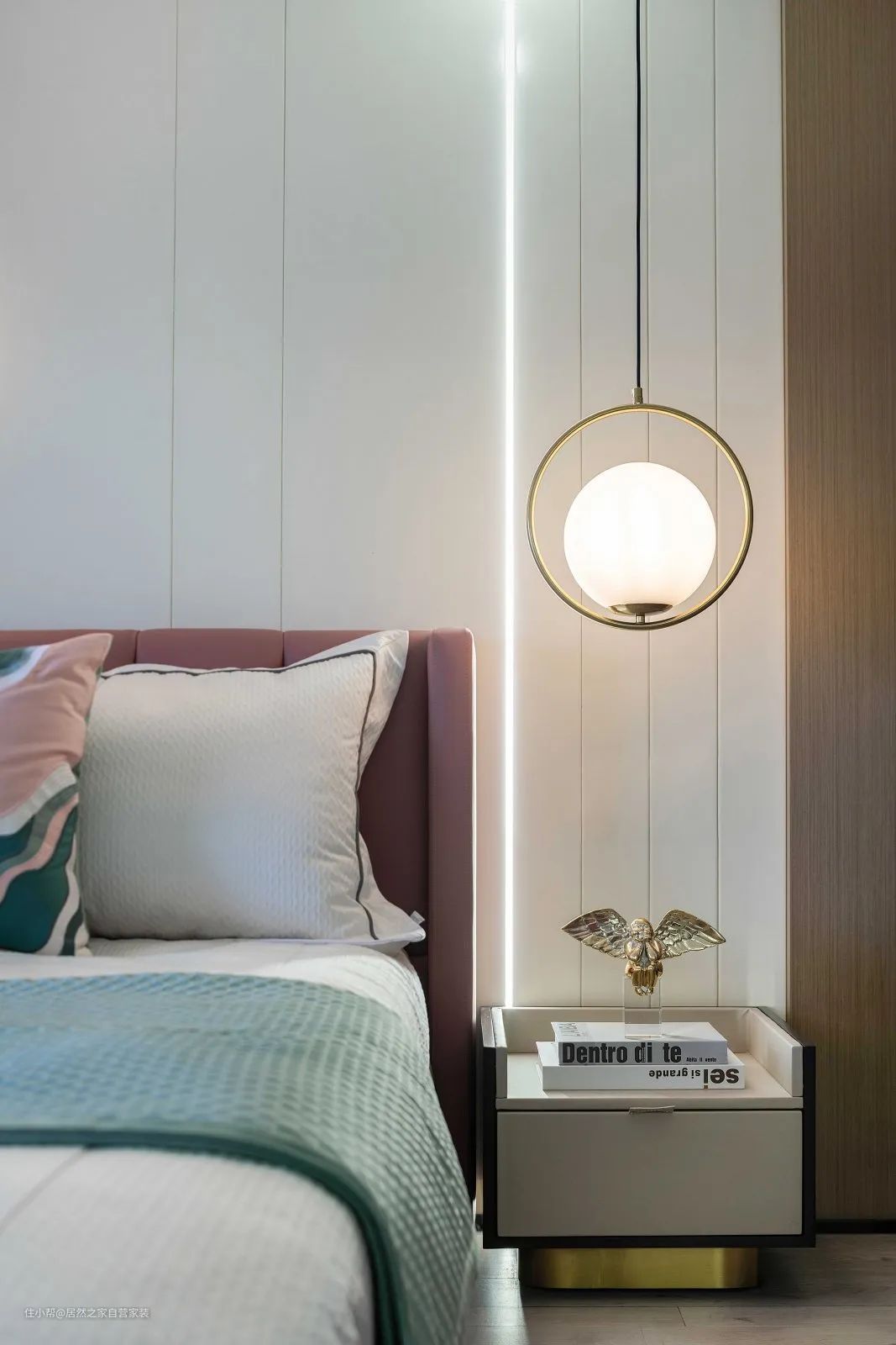 ▲床头旁边的床头柜上装一盏球形的吊灯,床头墙的硬包板之间也卡入了条形的灯带,精致的细节灯光设计,也让空间显得明亮舒适。