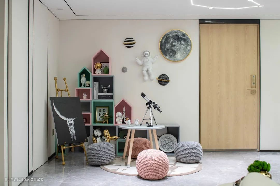 ▲儿童玩耍区摆上粉色与灰色的毛织凳子与小茶几,还有小黑板画、小屋造型的书架、太空主题的装饰画与摆饰品,让空间显得格外的梦幻童趣。