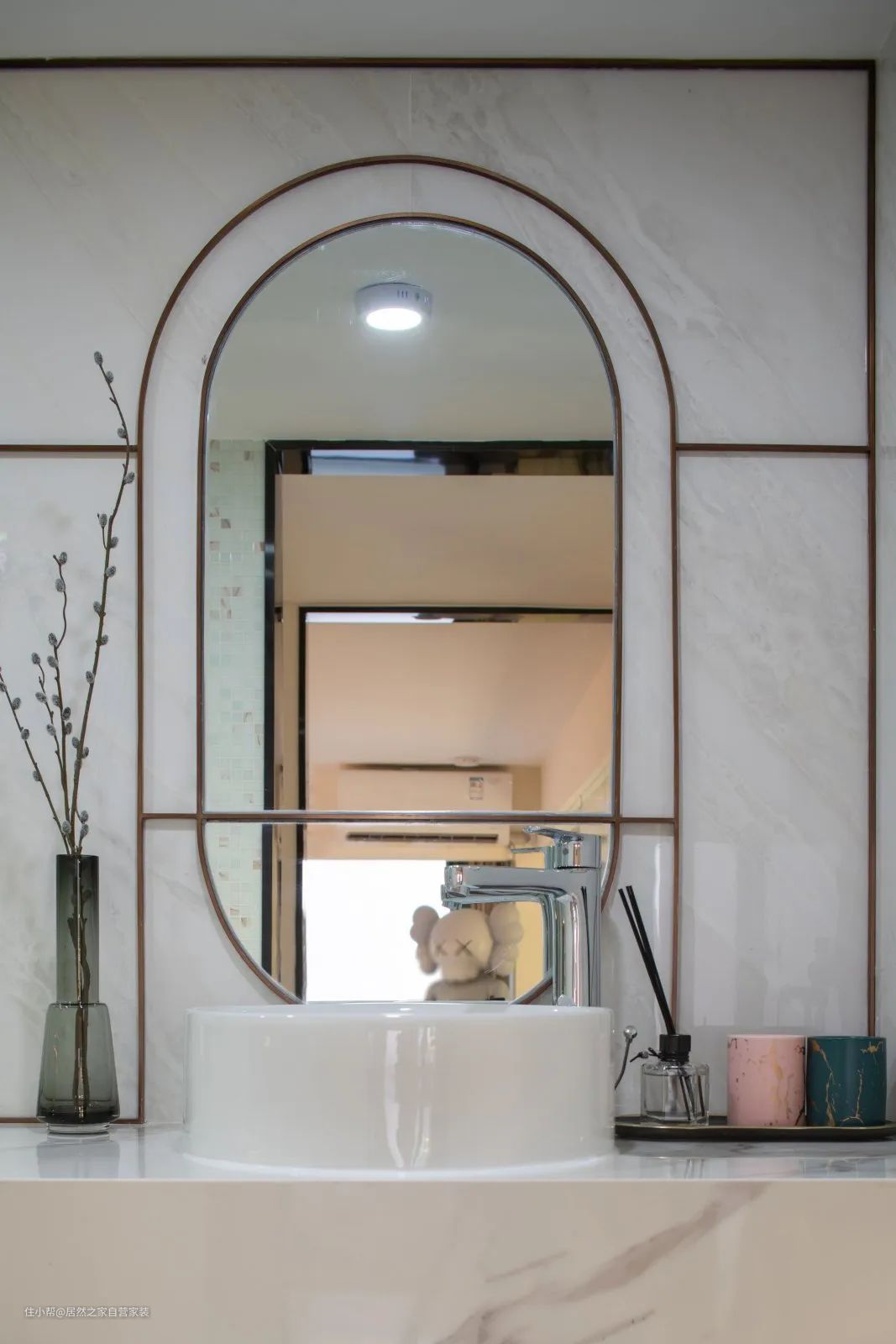 ▲卫生间大理石纹理的墙砖基础,加入金属框的镜子,搭配台上盆,布置花瓶、香薰与水杯,营造出一个精致优雅的卫浴空间。