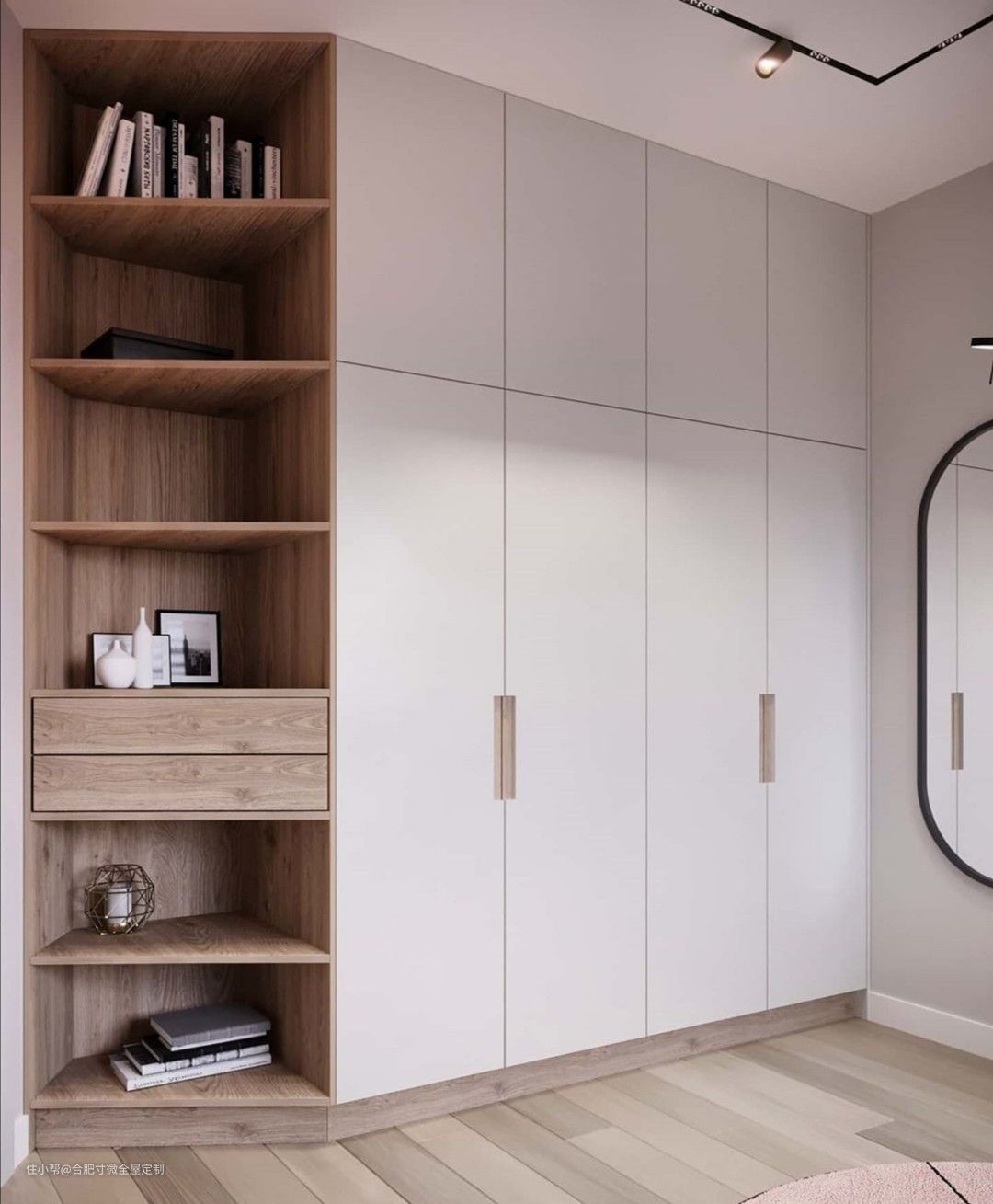 一般卧室入门手边就是衣柜,出入卧室忘带东西也很麻烦,有的人会选择在衣柜侧边贴挂钩,但真的很影响美观,不如改做成侧边柜,开放式收纳很方便放一些随手物品。
