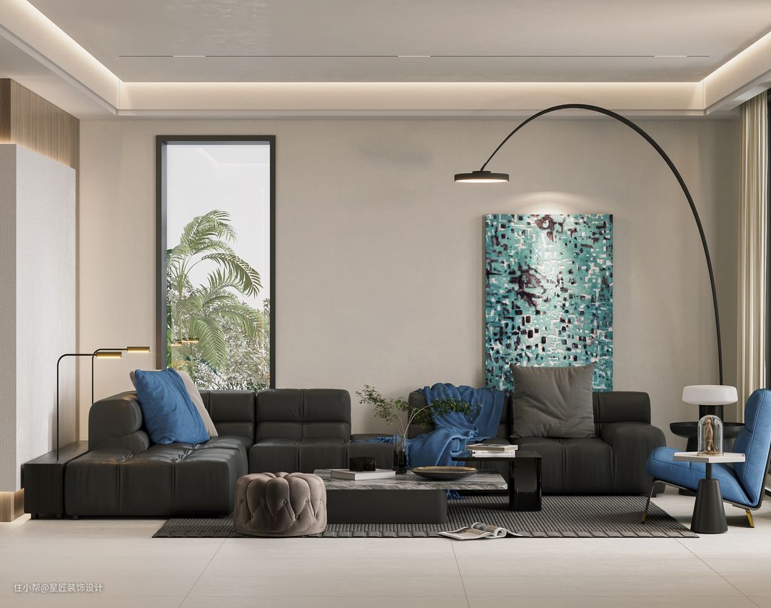 客厅背景采用了灰色与蓝色做为配搭与窗外的绿色园林形成视觉对比