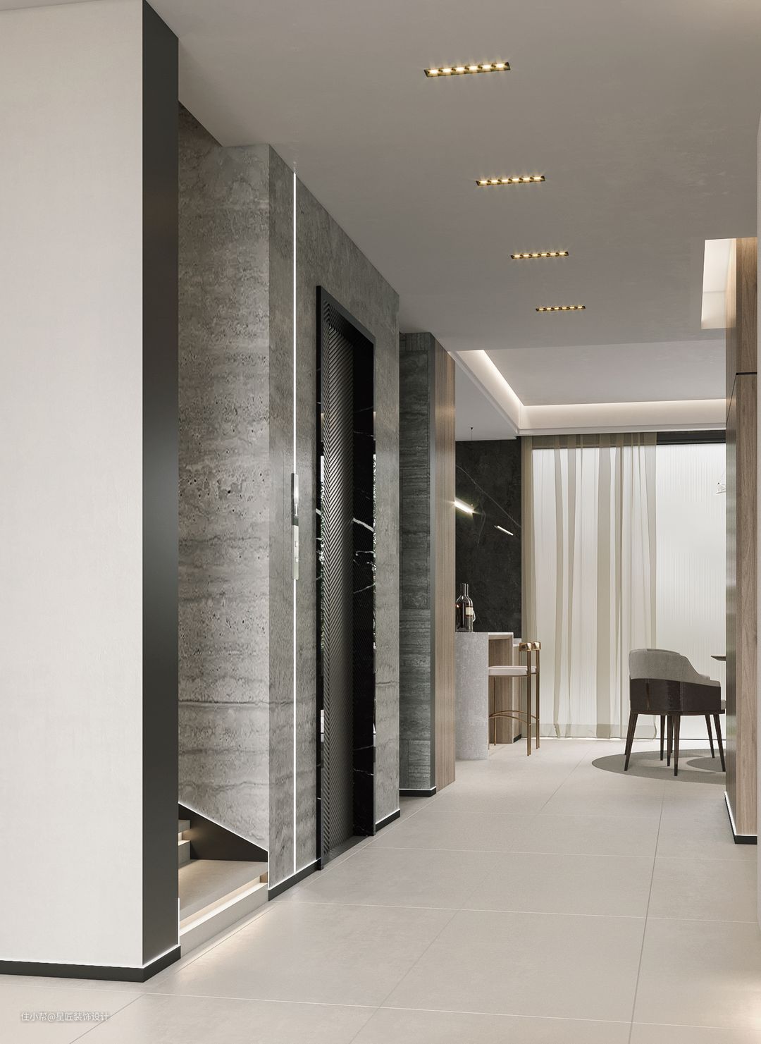 过道也采用了多组线灯做为照明光源,吊顶则嵌入暖色调灯珠作为过度