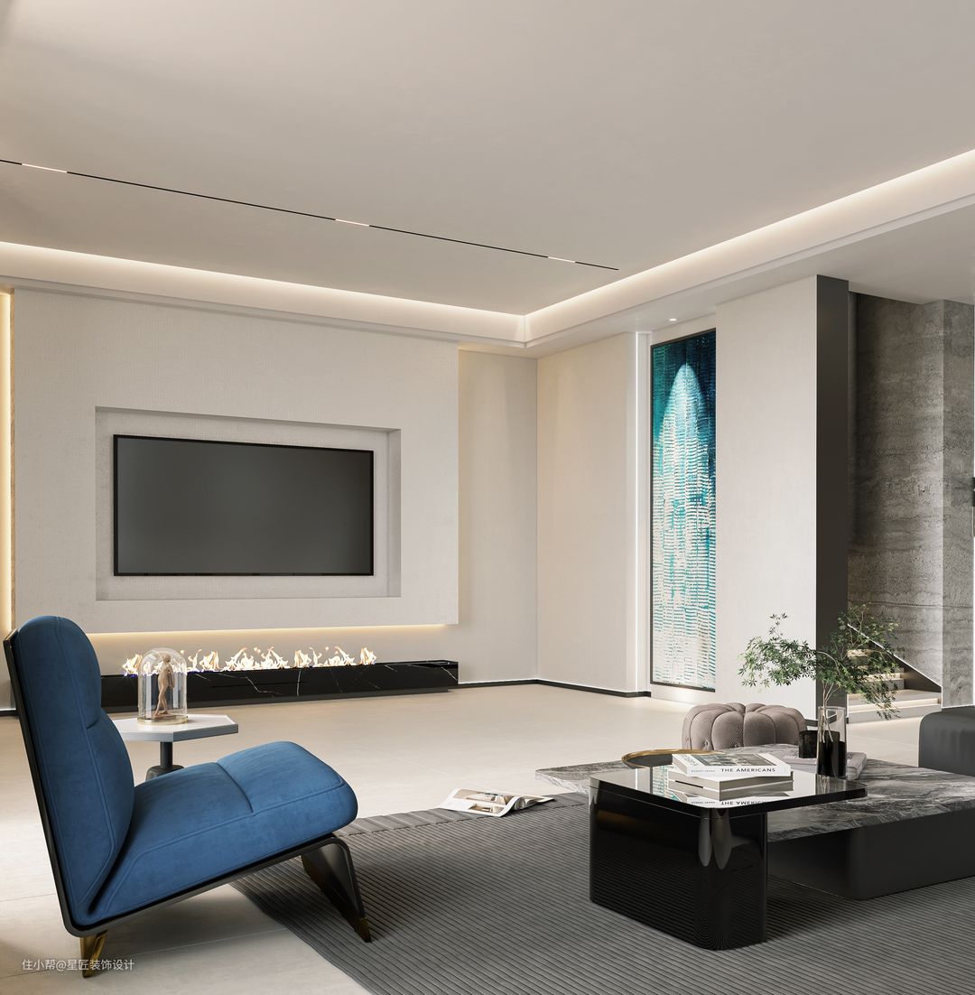 整体以简约为主,背景墙素雅又不失线条感,无主灯设计全线形灯,让整体观感规整,线条分明