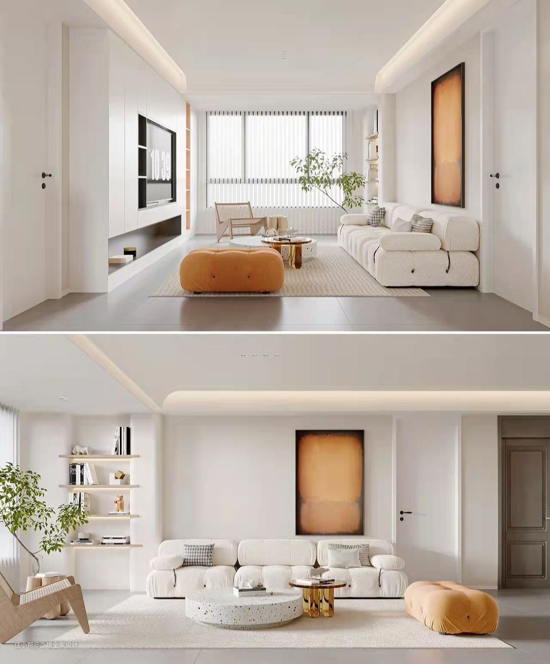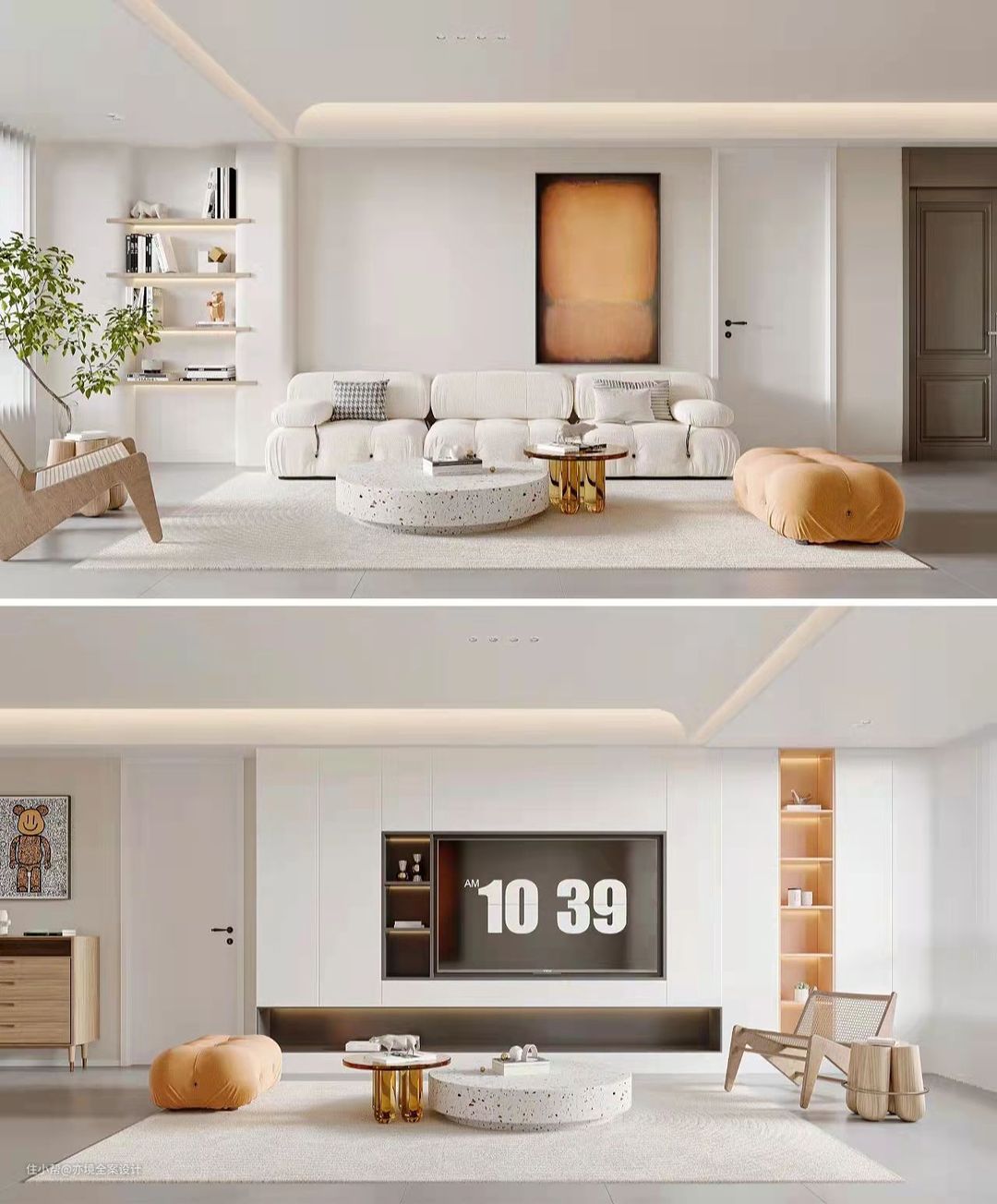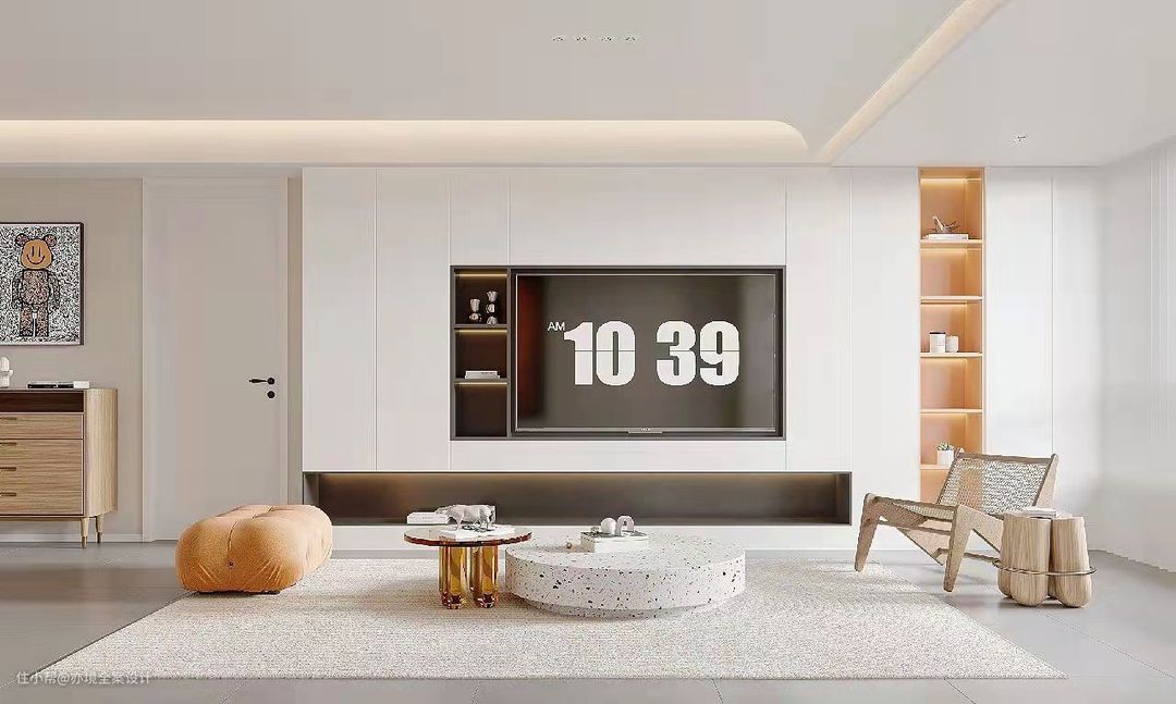 客厅的设计-电视背景墙;采用弧形悬浮无主灯设计搭配极简白主题,颜值非常棒