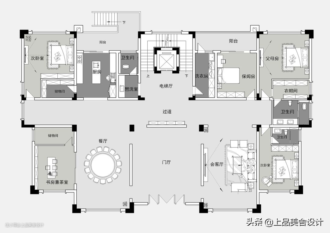 一层主要是父母住,大厨房大餐厅安排在了一楼,安排了5间房,进门是大门厅,也有些地方称呼为堂屋,预留了电梯井