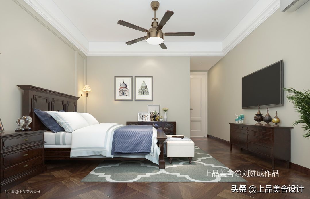 父母房墙面依然采用驼灰色来做主色调,大面积窗户的采光搭配栗色美式家具,高级感油然而生,实木吊扇灯在炎热的夏天带来了一丝清凉