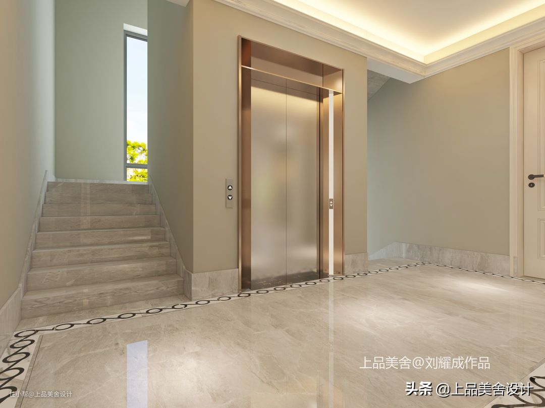 电梯间同样延续客餐厅的设计,金属质感的门套,就是整个空间的焦点