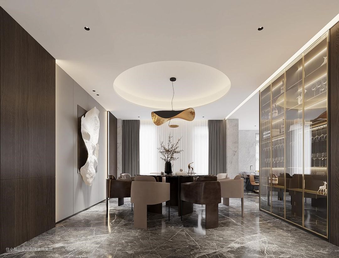 餐桌后方是一组酒柜,酒柜的设计采用开放式透明玻璃元素,内设线性灯照射,轻奢风格,时尚大气,除此之外,设计师还特地在酒柜展架设计了雕塑,提升整体的空间层次感。