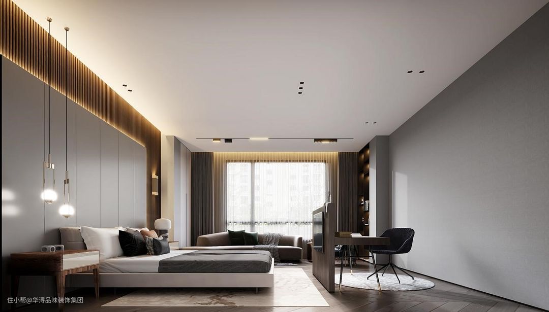 次卧2地板同样选择了木板元素,墙面使用的是定制的白色岩板,床头设计吊顶灯,和顶部线性灯想呼应,卧室还设计了半隔离式办公桌,挨近飘窗的位置设计了一组皮质沙发,享受休闲时光。