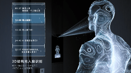 因为它3D结构光模组有3万个光点激光散射斑,密集识别面部轮廓,并且会智能过滤掉发型、帽子等干扰信息,识别精准度非常高,误识别率小于0.0001%。