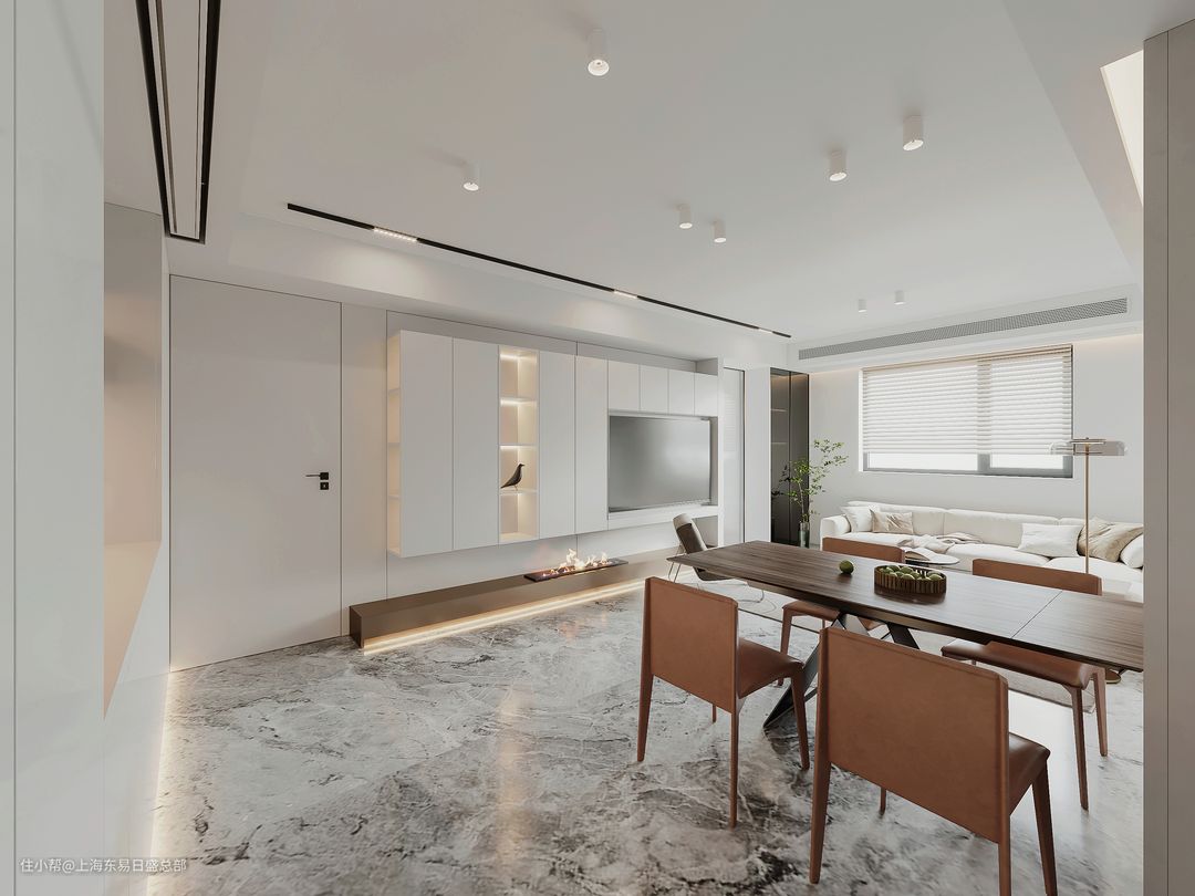 2.客餐厅不仅满足基本功能区域,同时也在侧墙做了整体的橱柜,增加储物空间;