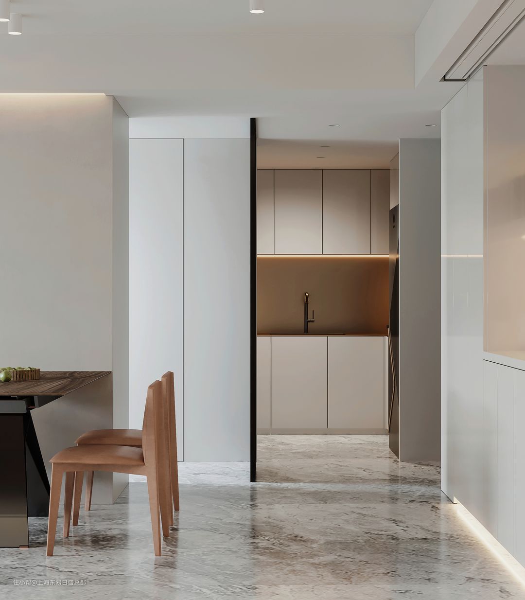 我们将原有的厨房调整位置开放出来,白色混油饰面、金属不锈钢、灯带的使用让整个空间更加宽敞,多人使用都不会感觉太拥挤,与餐厅的动线也更加舒适简洁。