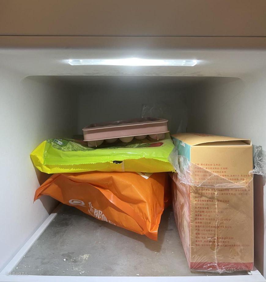 如果有单独放冰盒的平面,可能会好一些,但很可惜,疫情当下,我的冰箱没有那么空,只能委屈它放在两袋速食的上面。