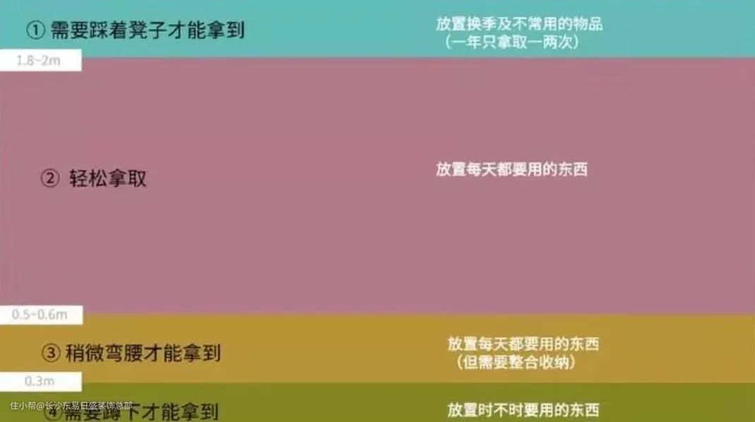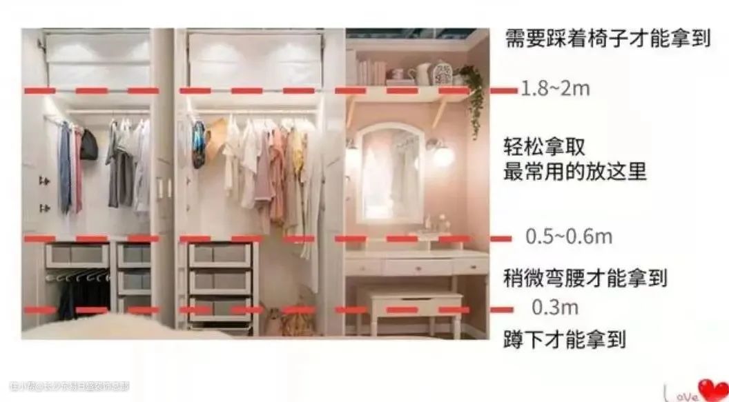 从收纳效率来说,把衣服挂起来是最好的选择,能挂的尽量都挂,拿取方便,一般的参考高度为: