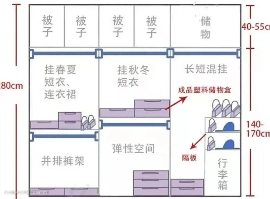 为了更好的分门别类、收纳置物,衣柜内部都会分成不同的功能区,大致结构如下: