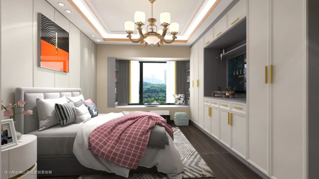 次卧作为客卧使用,同样采用木纹岩板铺贴,整个空间安静整洁。简单素雅的衣柜与床单,搭配上米白色的储物柜台,即合理的的运用了空间,同时也最大限度增加了储物能力,整体显得精致高雅。